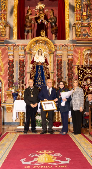 Al concluir la Eucaristía por el XXVI Aniversario de la Coronación Canónica de la Stma. Virgen del Primer Dolor y tras el recital lírico, se hizo entrega, de manera oficial, a las Madrinas del año 2026 de los tercios pertenecientes a la Agrupación; Dña. Mari Carmen Navarro Hernández, del tercio 'Jesús y María en casa de Lázaro', Dña. María Monge Cervantes del tercio 'Santísima Virgen del Primer Dolor' y a Dña. Caridad Ros Izquierdo del tercio 'Ntra. Sra. de la Esperanza'.