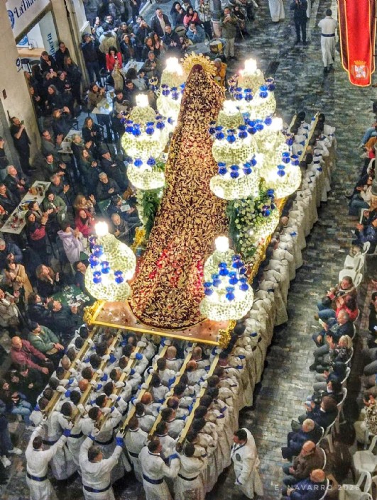 En la misma, se pudieron contemplar varias novedades, como el trabajo de restauración de los ángeles que van en el trono, realizado por D. José Mª Hernández Dólera, y sufragado por la Camarera de la Imagen, Dña. Mª de los Ángeles Ruiz Valverde; D. Jacinto Lorente, había completado los trabajos de dorado y resturación de la totalidad del trono en su taller de Nonduermas. La Madrina del 2025 del tercio de la Stma. Virgen del Primer Dolor, la Sra. Jumilla, había donado 2 unidades de tubo rectangular de aluminio para las varas del trono, así como una plancha de acero inoxidable para el chapado de los costados del mismo. La Imagen de la Stma. Virgen del Primer Dolor también ha sido recientemente restaurada por el CRRM, cuyos miembros, han presenciado la salida de la procesión.